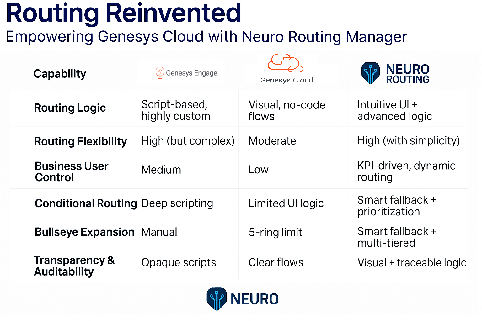 Neuro Routing Manager isn’t just a tool – it’s a strategic enabler for CX transformation. It gives Genesys Cloud the routing muscle of Engage, with the agility of a cloud-native platform.